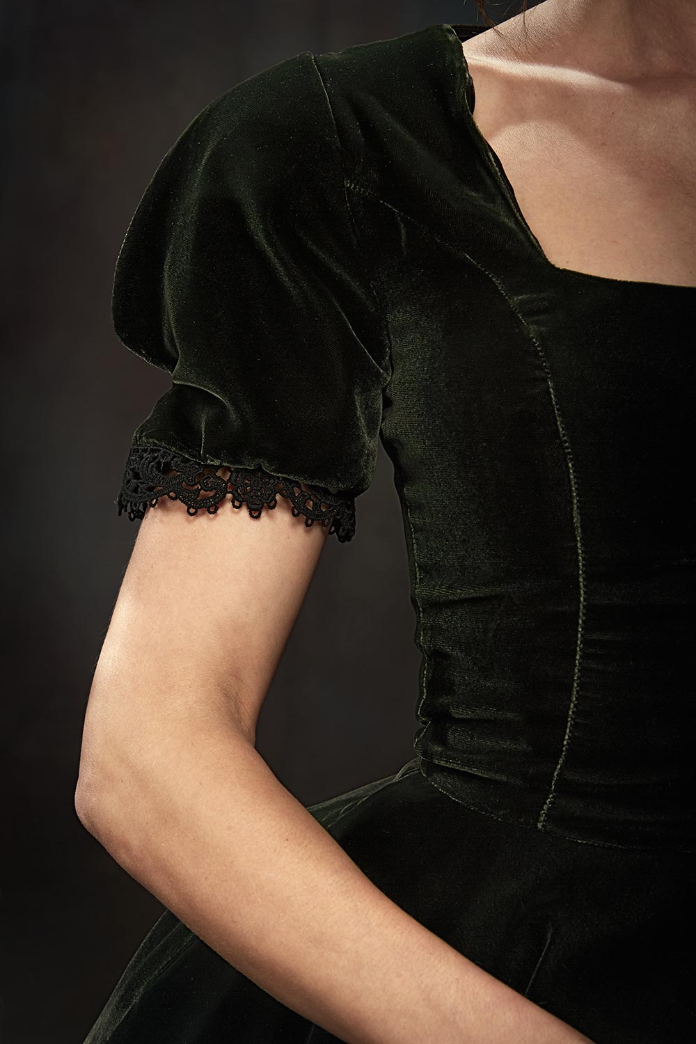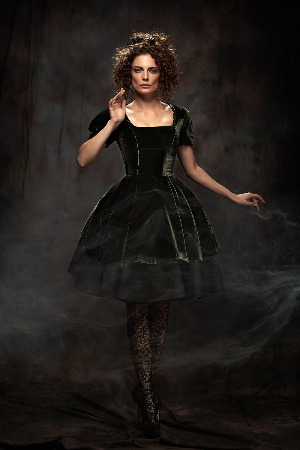 Fitted velvet dress with detachable underskirt of cotton and tulle